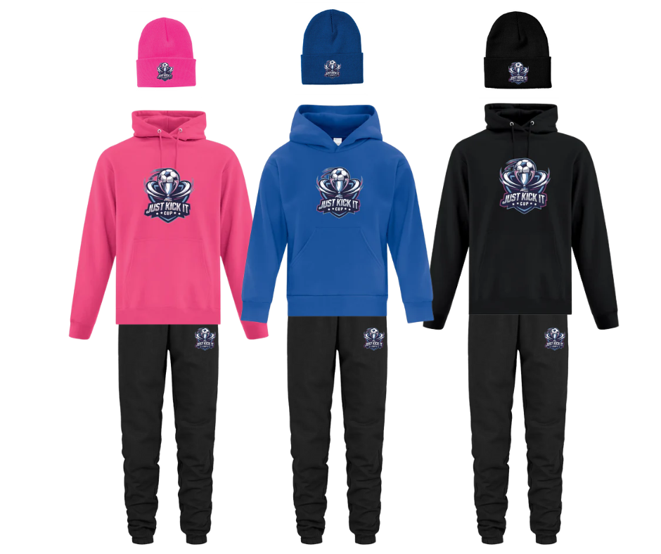 All items feature the new Just Kick It Cup logo, with Hoodies and Beanies in bright PINK, BLUE and BLACK